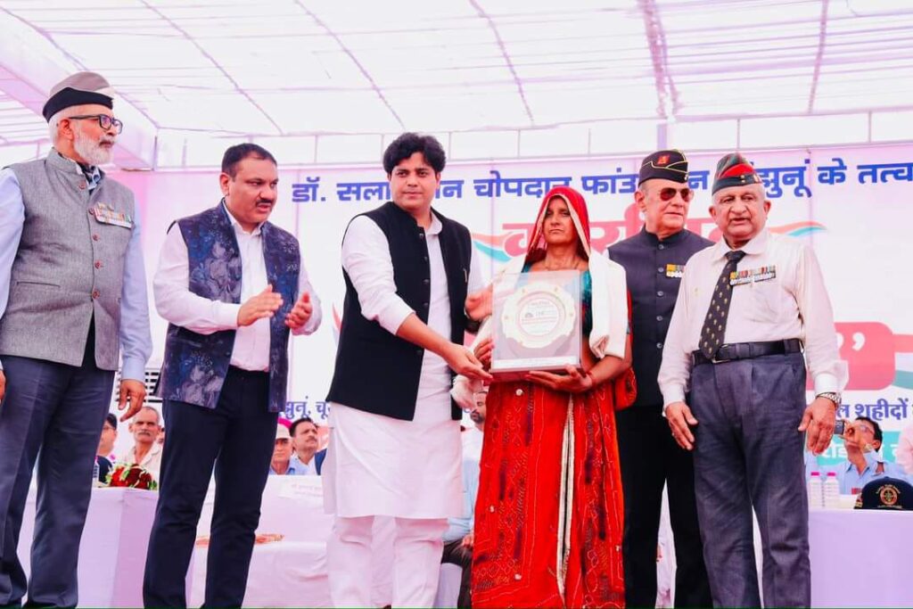 झुन्झुनूं: झुन्झुनूं स्थित कर्बला मैदान में डॉ. सलाऊदीन चोपदार फाउंडेशन के तत्वाधान में ‘शहादत को सलाम‘ कार्यक्रम दो संत चंचलनाथ जी का टीला के पीठाधीश्वर मंहत ओमनाथ जी महाराज एवं दरगाह हजरत कमरूदीन शाह के सज्जादानशीन एजाज नबी साहब के सानिध्य में आयोजित हुआ। कार्यक्रम में शेखावाटी क्षेत्र (झुन्झुनूं, चुरू, सीकर व नीम का थाना) के कारगिल युद्ध में लड़ने वाले योद्धाओं, कारगिल शहीदों की वीरांगनाओं एवं गेलेंट्री अवार्डधारियों सहित 130 जनों का सम्मान किया गया। कार्यक्रम के मुख्य अतिथि राज्यसभा सांसद एवं प्रखर वक्ता इमरान प्रतापगढ़ी, विशिष्ट अतिथि के तौर पर मेजर जनरल ए.जे.बी. जैनी, लेफ्टिनेंट जनरल एस.पी.एस. कटेवा, कारगिल महानायक ब्रिगेडियर अजीत सिंह शेखावत, कर्नल शोकत अली, सैनिक कल्याण अधिकार कर्नल अनिल पूनियां, कैप्टन शोकत अली, डॉ. सलाऊदीन चोपदार फाउंडेशन के चैयरमेन डॉ. सत्तार दीवान उपस्थित थे। कार्यक्रम के आयोजक राजस्थान मदरसा बोर्ड के चैयरमेन एम.डी. चोपदार ने आये हुये तमाम अतिथियों का मोमेन्टो, शॉल एवं केप पहनाकर स्वागत किया। श्री चोपदार ने गंगा जमुनी तहजीब का जिक्र करते हुये कहा कि ये जिला साम्प्रदायिक सद्भाव की मिशाल है, यहां धर्म और जाति से बढ़कर राष्ट्रवाद की भावना देखने को मिलती है। उन्होंने कारगिल युद्ध में शौर्य और पराक्रम की भूरि-भूरि प्रशंसा की और कहा कि यहां के लोग देश के लिये अपने प्राणों की आहुति देने के लिये हर समय तैयार रहते है। कार्यक्रम के मुख्य अतिथि इमरान प्रतापगढ़ी ने कहा कि मेरा दुर्भाग्य है कि मेरा जन्म शेखावाटी जैसी वीर जन्म भूमि पर नहीं हुआ। उन्होंने कहा कि जो नफरत की दुकान खोले बैठे है वो एक बार शेखावाटी के वीरों की इस भूमि पर आयें और देखें कि लोग कितनी मोहब्बत के साथ यहां रहते है। उन्होंने कहा कि यहां के लोगों ने बड़ी-बड़ी कुर्बानियां देकर इस जिले को मान पूरे भारत में बढ़ाया है। उन्होंने ये भरोसा दिलाया कि यहां कि कुर्बानियों का जिक्र में पूरी दुनिया में करूंगा और उन्होंने वादा किया कि शेखावाटी के शहीदों का कार्यक्रम में दिल्ली में करूंगा। ब्रिगेडियर अजीत सिंह ने कारगिल से जुड़े बहुत से संस्करण साझा किये। उन्होंने कहा कि हिन्दू-मुस्लिम करने वाले संकीर्ण सोच के व्यक्ति होते है, मैंने कारगिल में मुस्लिम कम्पनी की कमांड की थी जिसने अपने अदम्य साहस और शौर्य का परिचय देते हुये पाकिस्तान के दांत खट्टे कर दिये थे। कर्नल शोकत अली ने शेखावाटी की वीर वंसुधरा का जिक्र करते हुये कहा कि यहां के लोगों की नस-नस में देश के प्रति मोहब्ब्त एवं वफादारी देखने को मिलती है। कार्यक्रम में शहीदों से संबंधित एक पुस्तक का भी विमोचन किया गया जिसमें शेखावाटी के समस्