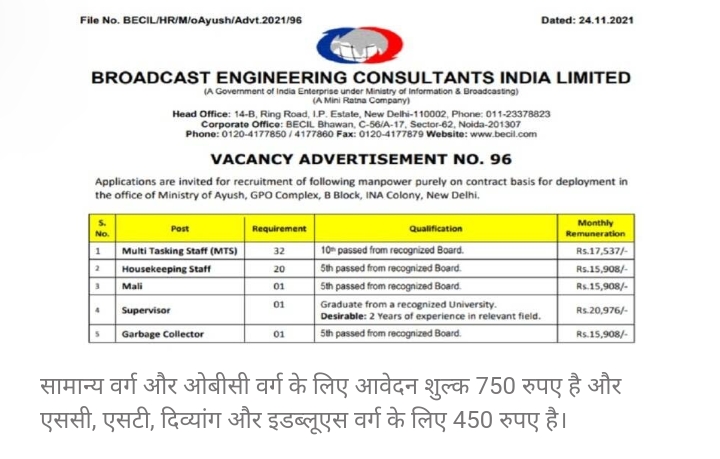 बीईसीआईएल में एमटीएस के 32 पद, हाउस कीपिंग स्टाफ के 20 पद, माली का एक पद, सुपरवाइजर का एक पद और गार्बेज कलेक्टर का एक पद खाली है।