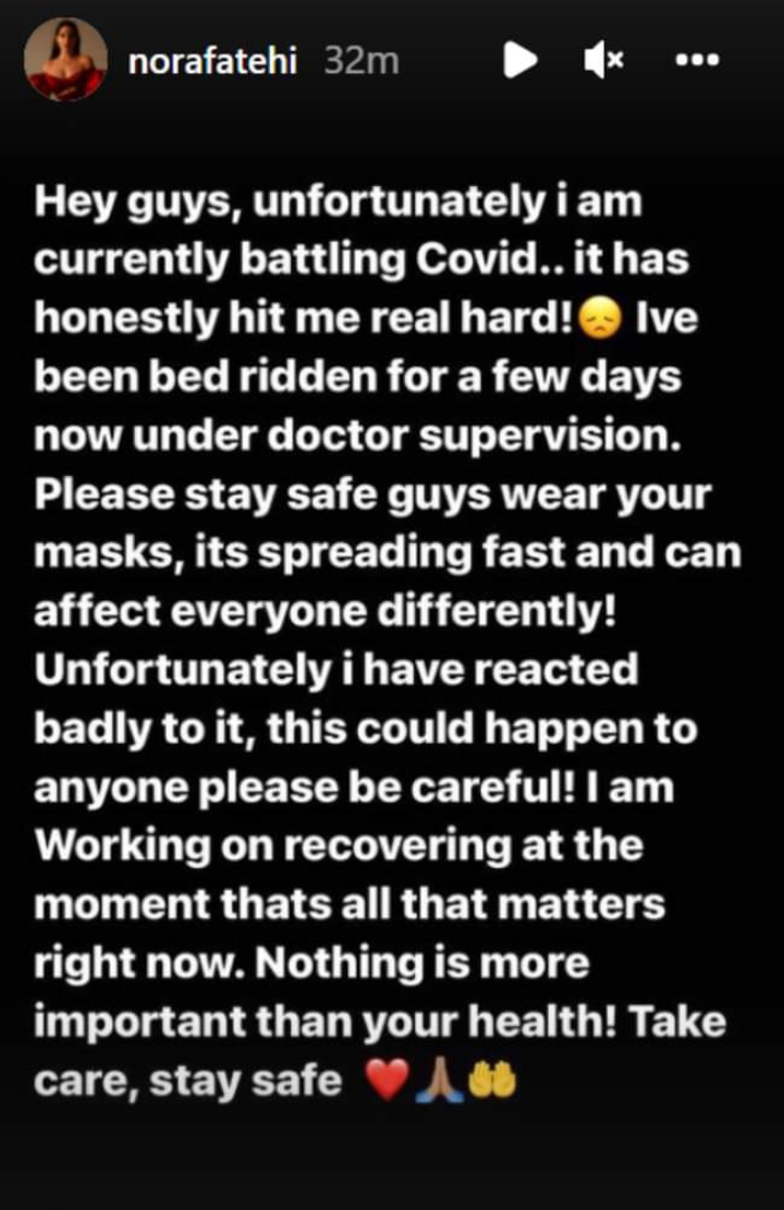 नोरा ने इंस्टाग्राम स्टोरी में अपनी सेहत की जानकारी दी, जिससे लगता है कि उनकी तबीयत गंभीर है। नोरा ने लिखा- दोस्तों, दुर्भाग्य से मैं अभी कोविड से जूझ रही हूं। इसने मुझ पर वाकई में असर किया है। कई दिनों से बिस्तर से नहीं उठ पा रही हूं और डॉक्टरों की निगरानी में हूं। कृपया सुरक्षित रहिए और मास्क पहने रहिए। यह तेजी से फैल रहा है और किसी को भी अलग ढंग से हो सकता है। दुर्भाग्य से मुझ पर बुरा असर हुआ है। यह किसी को भी हो सकता है। मैं ठीक होने की कोशिश कर रही हूं। फिलहाल यही मायने रखता है। सेहत से जरूरी कुछ भी नहीं। स्वस्थ रहिए। सुरक्षित रहिए।